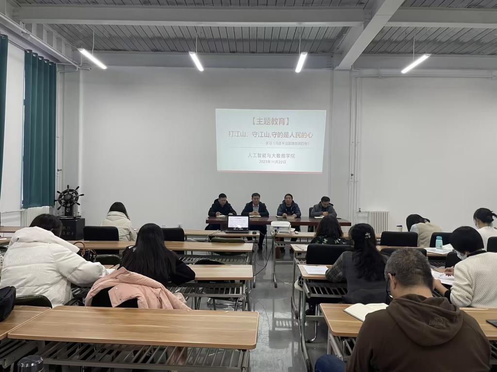 11月22日下午在知行楼C118室,人工智能与大数据党总支组织全体党员开展习近平新时代中国特色社会主义思想专题学习,集中学习了《习近平治国理政第四卷》----打江山、守江山、守的是人民的心。本次主题教育由书记朱福生领学。习近平总书记在庆祝中国共产党成立100周年大会上的重要讲话中指出:“江山就是人民,人民就是江山,打江山、守江山、守的是人民的心。”中国共产党的百年历史是一部矢志践行初心使命的历史。中国共产党为人民而生,因人民而兴,自诞生之日起,就把为中国人民谋幸福,为中华民族谋复兴确立为自己的初心和使命。以百姓心为心,是党的初心,也是党的恒心。始终坚持全心全意为人民服务的根本宗旨,保持党同人民群众的血肉联系,这是我们党不断取得胜利的力量源泉。