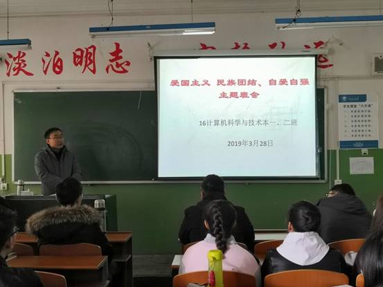 2019年3月28日中午13:30,2016级计算机科学与技术本一、二班在敏学楼308教室召开了爱国主义、民族团结及自爱自强主题班会,班会由班主任耿卫江主持。