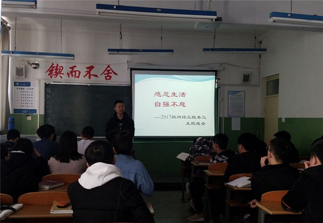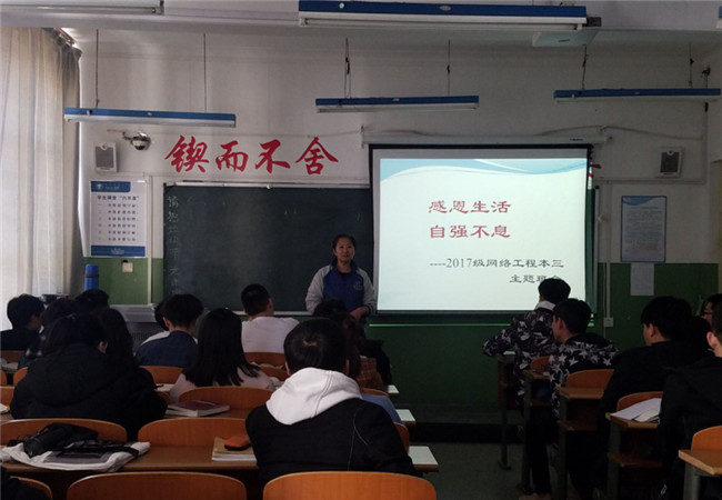 2019年4月2日上午11:00,2017级网络工程本三班在敏学楼305召开了“感恩生活 自强不息”的主题班会,班会由班主任辛日华老师主持,邀请到本班考取了国家综合性消防救援的消防员陈峻同学。