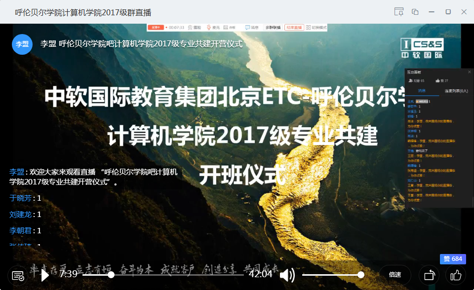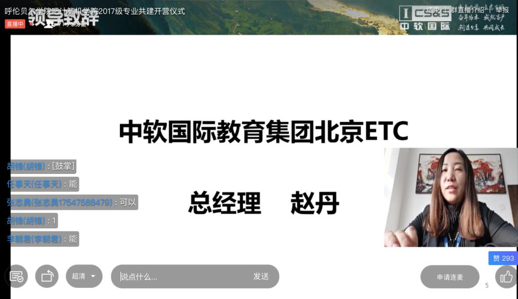 2020年3月2日,14点40分,中软国际教育集团北京ETC通过线上软件直播了2017级计算机公司专业共建员工的开营仪式,莅临本次仪式的领导有教育集团北京ETC总经理赵丹、计算机公司副经理刘仁山、教育集团北京ETC执行总经理胡锋、计算机公司系主任王荣芝、北京ETC执行总经理助理马翼鹏、教学总监韩耀锋、质量监管部经理范海霞、就业部经理刘建龙、教务经理于晓芳、项目经理王岚、教务部班主任李盟。