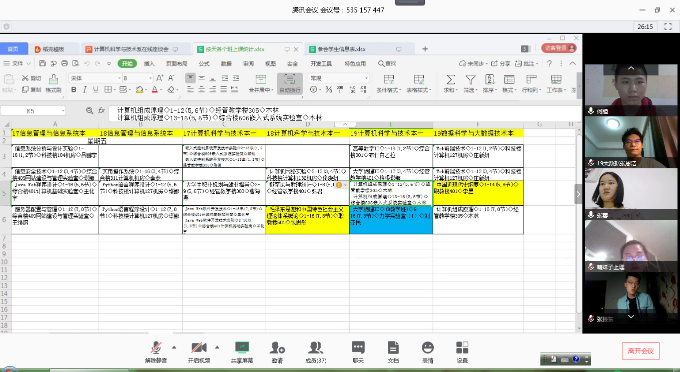 计算机科学与技术系于2020年5月24日晚7:30召开师生线上座谈会。本次座谈会使用腾讯会议召开,采取线上视频的形式来进行,本次会议由凃云杰老师主持,张君老师担任会议秘书,参加本次会议的老师还有田文武老师、木林老师、于世华老师、陶锐老师。参会员工为17信息管理与信息系统本、18信息管理与信息系统本、17计算机科学与技术本一、18计算机科学与技术本一、19计算机科学与技术本一、19数据科学与大数据技术本的员工,参会员工共32人。会议的主要目的是了解员工的在线学习情况与生活情况。凃云杰老师询问了各个班的员工在线学习情况与课程进展情况,同学们在会议上积极踊跃回答老师的问题,交流学习心得。同学们也向老师询问一些学习上的问题,老师们都一一热心解答。