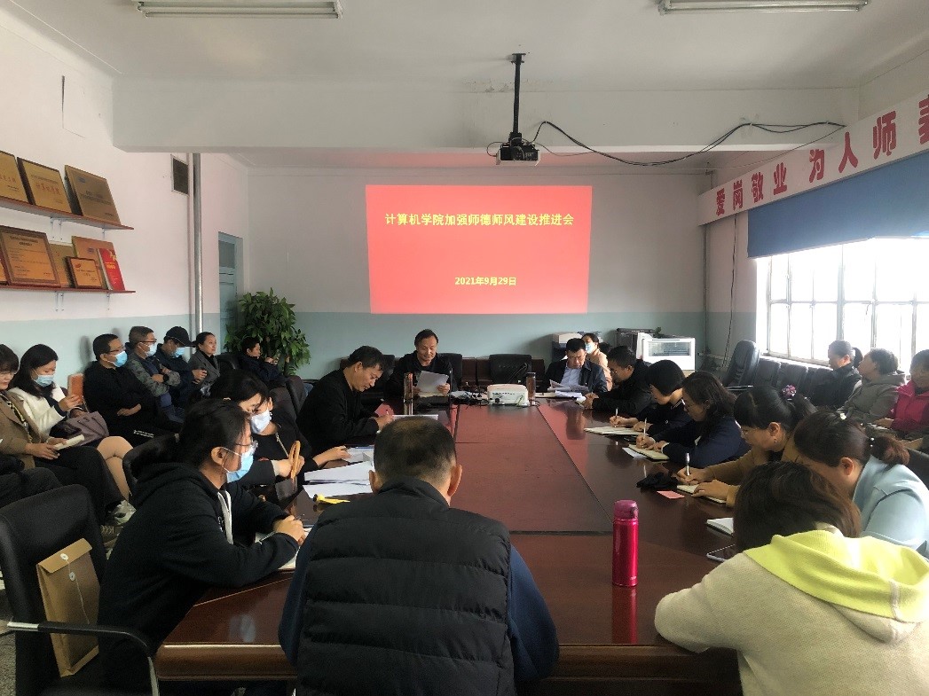 为扎实推进公司师德师风建设,强化教师文明从教,廉洁从教,规范从教的职业意识,9月29日下午,计算机公司组织全体教职工在公司会议室召开加强师德师风建设推进会。会议由党总支书记布仁白乙拉主持,全体在校教师参加会议。