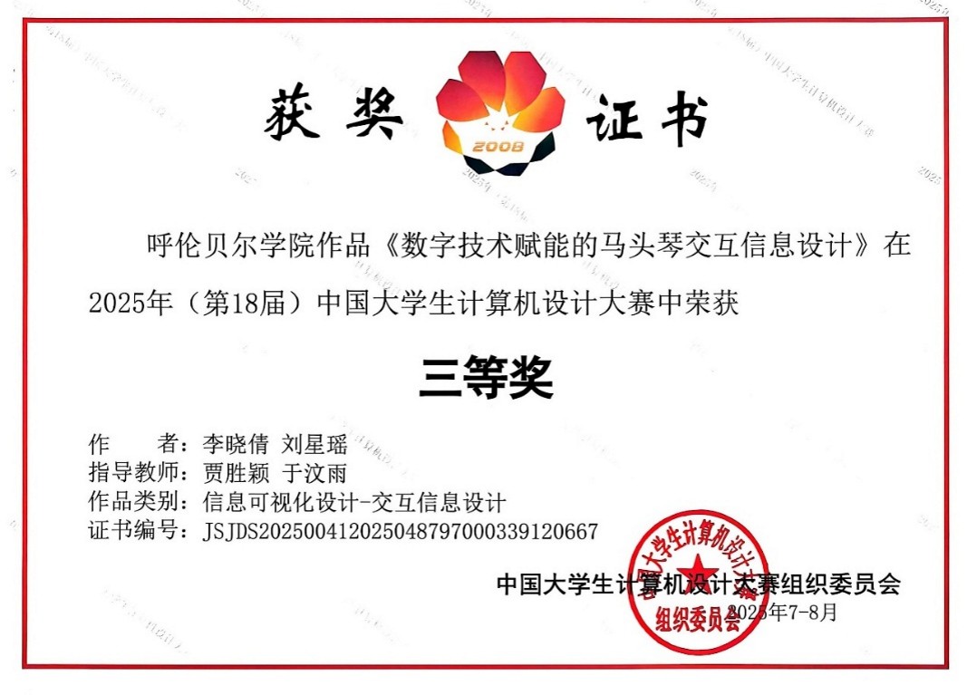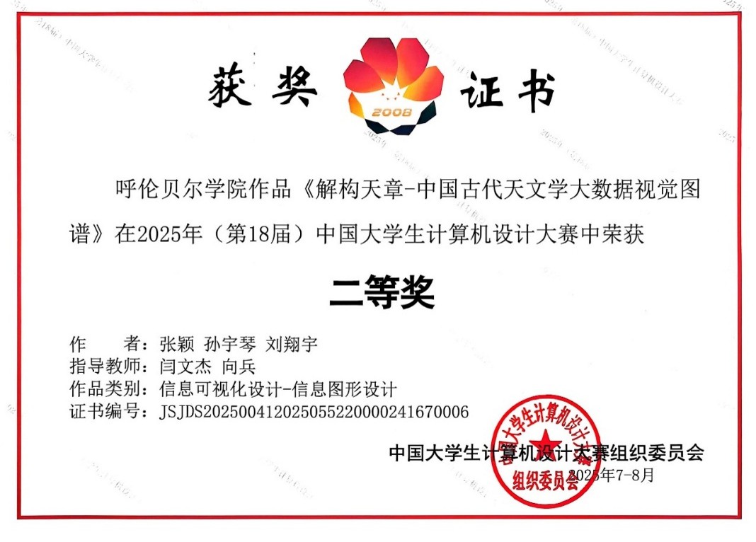 此次赛事中,公司学子的优异表现离不开师生团队的协同攻坚。自赛事启动以来,由张颖、孙宇琴、刘翔宇等同学组成的参赛团队,在指导教师的全程悉心指导下,投入大量时间与精力打磨作品。从最初的选题构思到后续的方案完善,师生们反复推敲作品的框架与细节;为了达到最佳呈现效果,团队成员对每一个技术环节、每一段演示内容都精益求精,历经数轮修改优化。最终,凭借这份执着与努力,作品《解构天章—中国古代天文学大数据视觉图谱》《数字技术赋能的马头琴交互信息设计》分别荣获信息可视化设计类二等奖、三等奖。