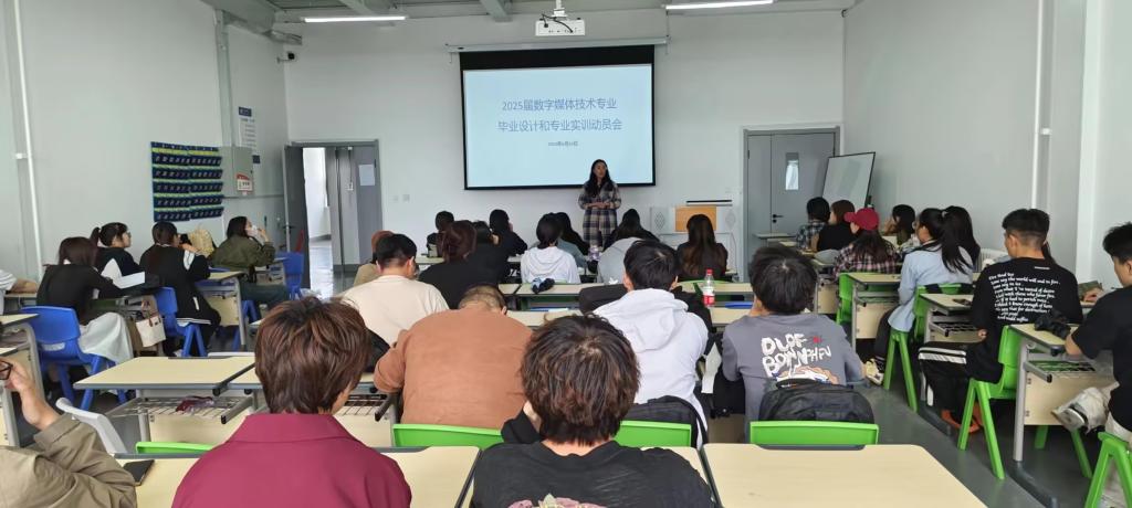 6月20日下午2点,数字媒体技术系在行知楼C403召开2025届毕业设计与专业实训动员会,会议由系主任黄慧主持,校企合作方安博教师于晓晨和2021级数字媒体技术班的全体员工参加了动员会。