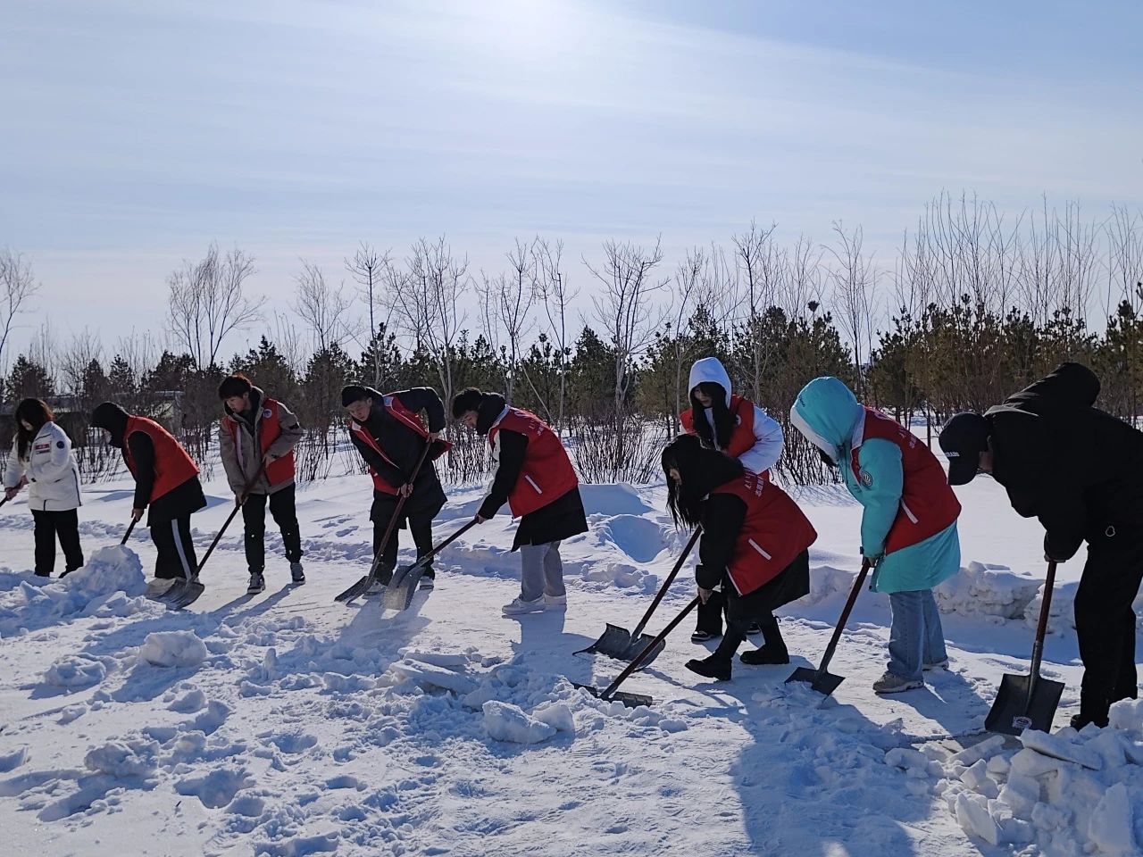 寒假的积雪增多,不同程度为同学们上下学必经之路造成阻塞。清扫中,同学们不畏寒冷,积极行动,拿上铁锹、推板等工具,对东山行知楼前后的道路、场地进行清理。