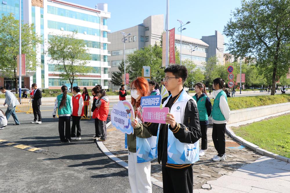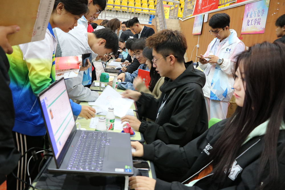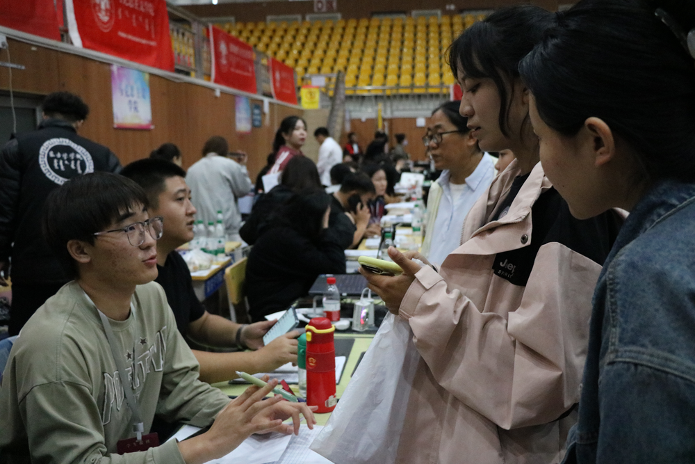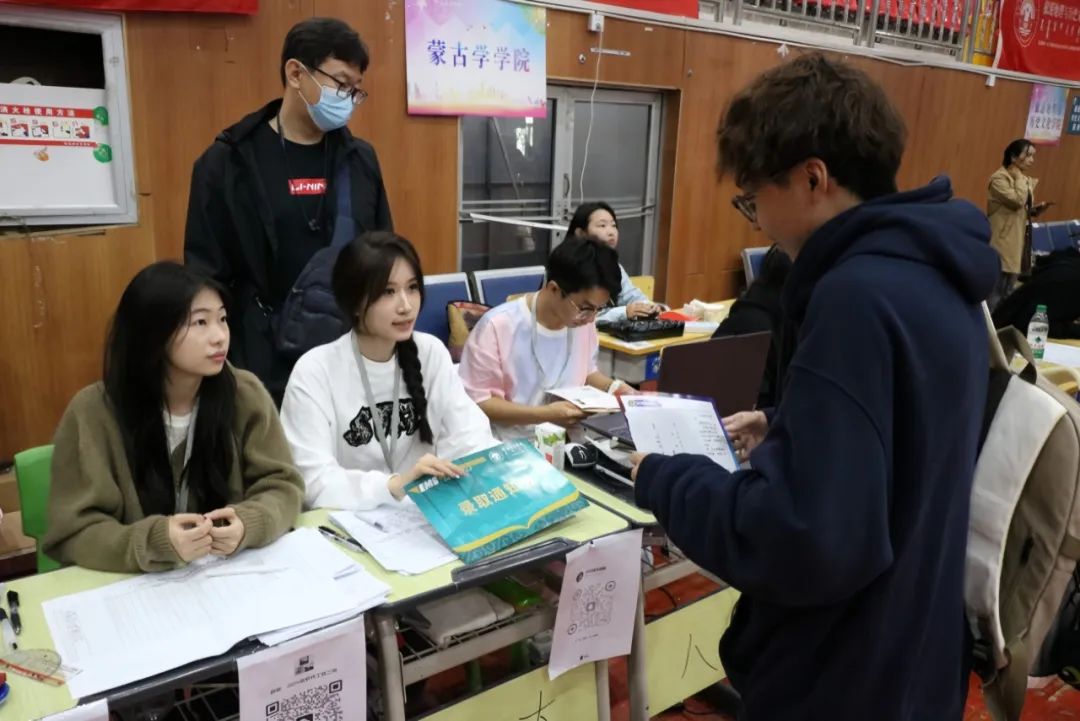 视角再次聚焦,体育馆内的工作同样出彩。学姐学长们帮助新生完成报道。