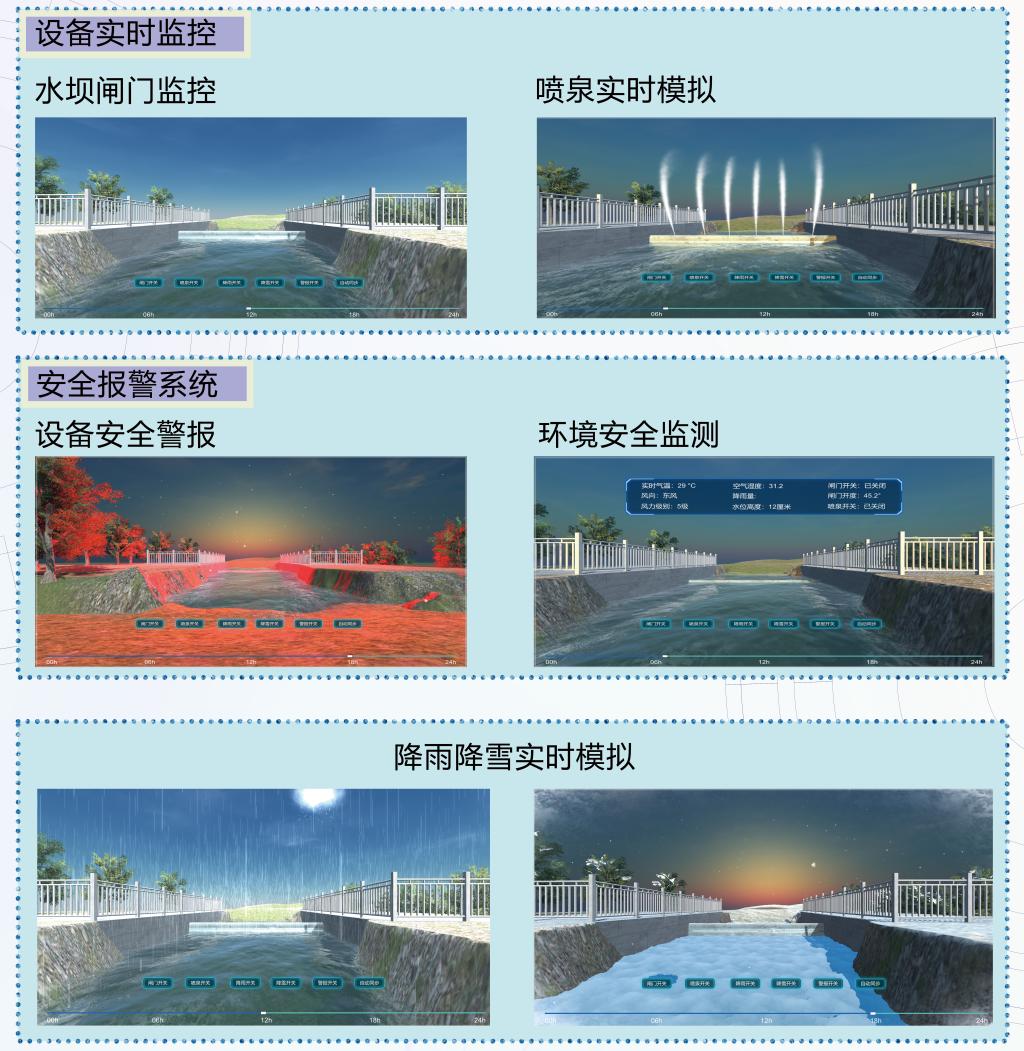 本作品根据西新河水坝的实时监控信息基于Unity3D开发的数字孪生软件,实时显示相关水坝的状态数据,包括闸门开启或关闭的动态效果,喷泉开启或关闭的动态效果;设备的安全报警(盗窃、损坏、变形、位移),环境安全报警(天气、火灾、水位、坍塌);能根据外部降雨、降雪的数据实时在虚拟环境中展示相应的效果。