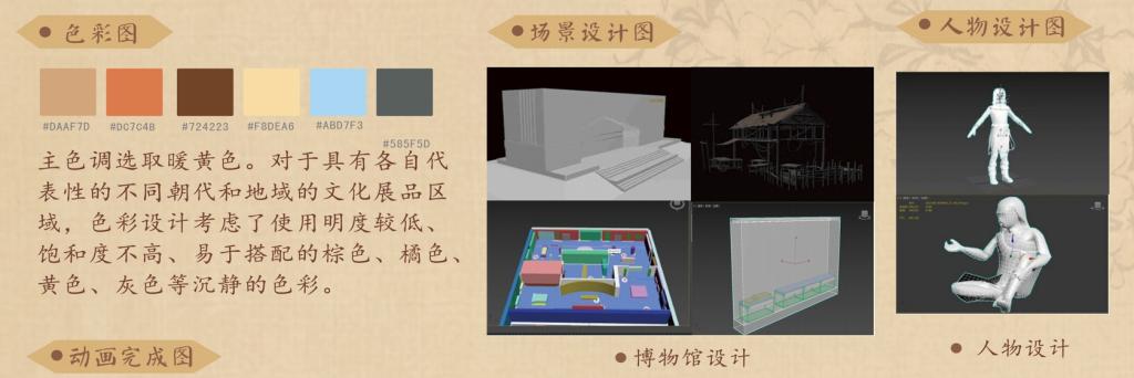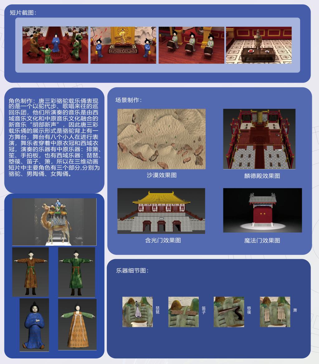 本作品运用三维动画技术制作一部表达唐三彩背后历史意义的短片,将唐三彩陶俑融入故事叙事中,将唐三彩载乐俑背后的文化意义用故事的形式表现出来。通过短片中唐代中原音乐和西域胡乐同时被人们演奏,中原人对胡乐的喜爱传递出唐代对于西域文化的包容。让更多的人们去了解唐三彩载乐俑文物的形象,色彩,历史价值等等。短片会结合一些沙漠,唐朝建筑宫殿,一些演奏乐器的场景更加生动的展示唐朝陶俑一些绚丽出彩的部分。